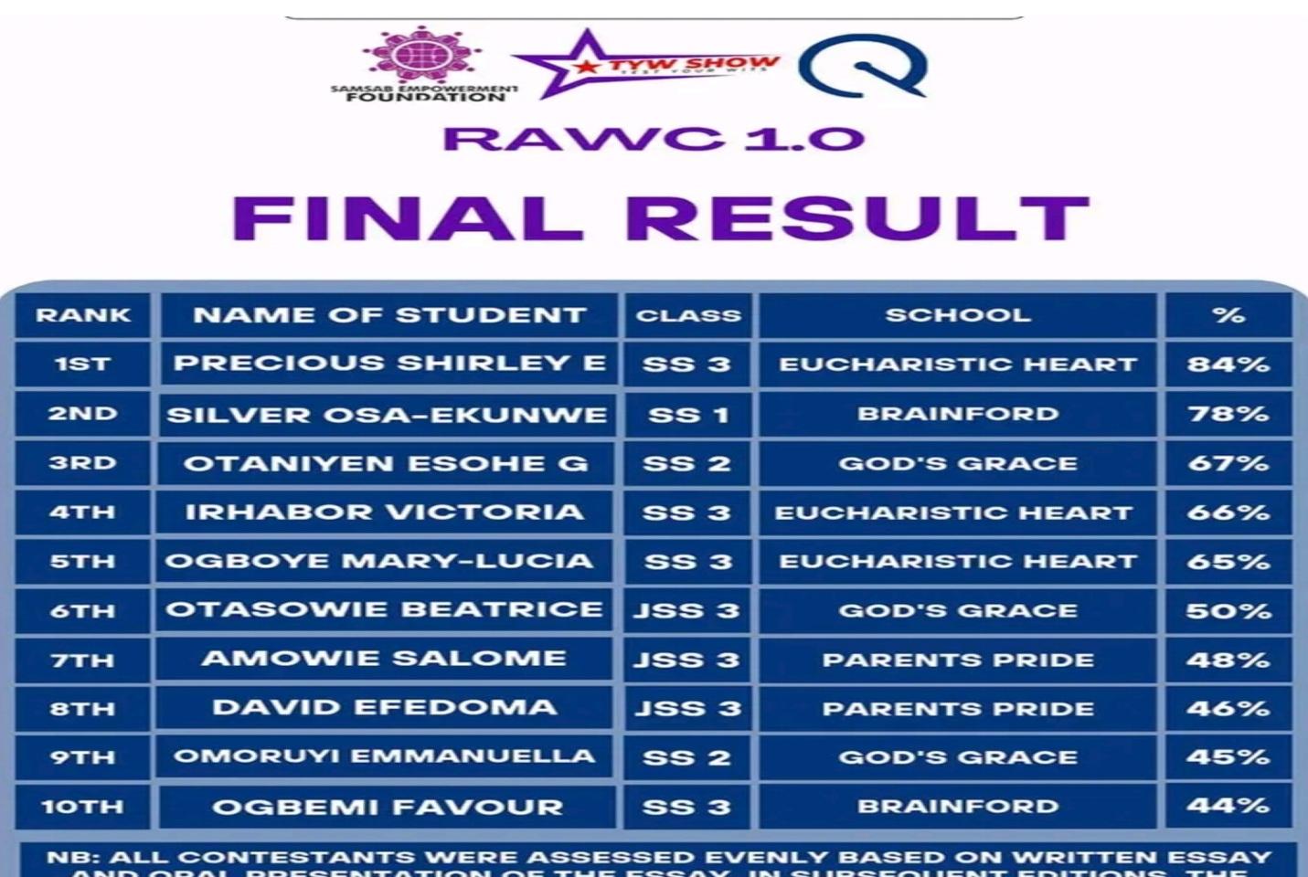 Eucharistic Heart of Jesus Model College Benin dominated the Mathematics Ambassador Competition, organized by the African Mathematics Project, across all year group categories. The results were as follows: